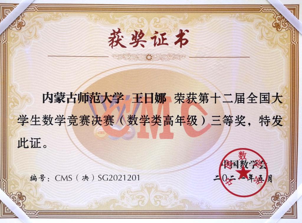 2021年5月14-16日,第十二届全国大学生数学竞赛决赛在吉林大学成功举办。我校学子首次入围全国总决赛,取得了可喜的成绩。经过激励角逐,由数学科学学院耿俊老师指导的2018级王日娜同学获得了数学类高年级组全国三等奖、win007官网