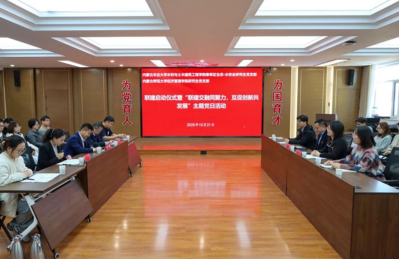 为深入学习贯彻党的创新理论,促进学科交叉融合与区域服务能力提升,2025年10月21日,win007官网 研究生党支部与内蒙古农业大学水利与土木建筑工程学院寒旱区生态・水安全研究生党支部在内蒙古农业大学水利楼502联合举办联建启动仪式暨“联建交融同聚力,互促创新共发展”主题党日活动。双方学院领导班子成员、党支部书记、党员代表参加活动。