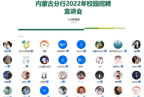 会议议程有四项:一、中国邮政储蓄银行内蒙古分行人力资源部李卓栩老师介绍win007、职业发展、福利待遇以及招聘公告等;二、中国邮政储蓄银行呼和浩特市分行人力资源部刘晓宇老师介绍了分行近五年的经营发展情况;三、呼和浩特市分行优秀员工代表苏强进行经验分享;四、线上咨询和交流环节。
