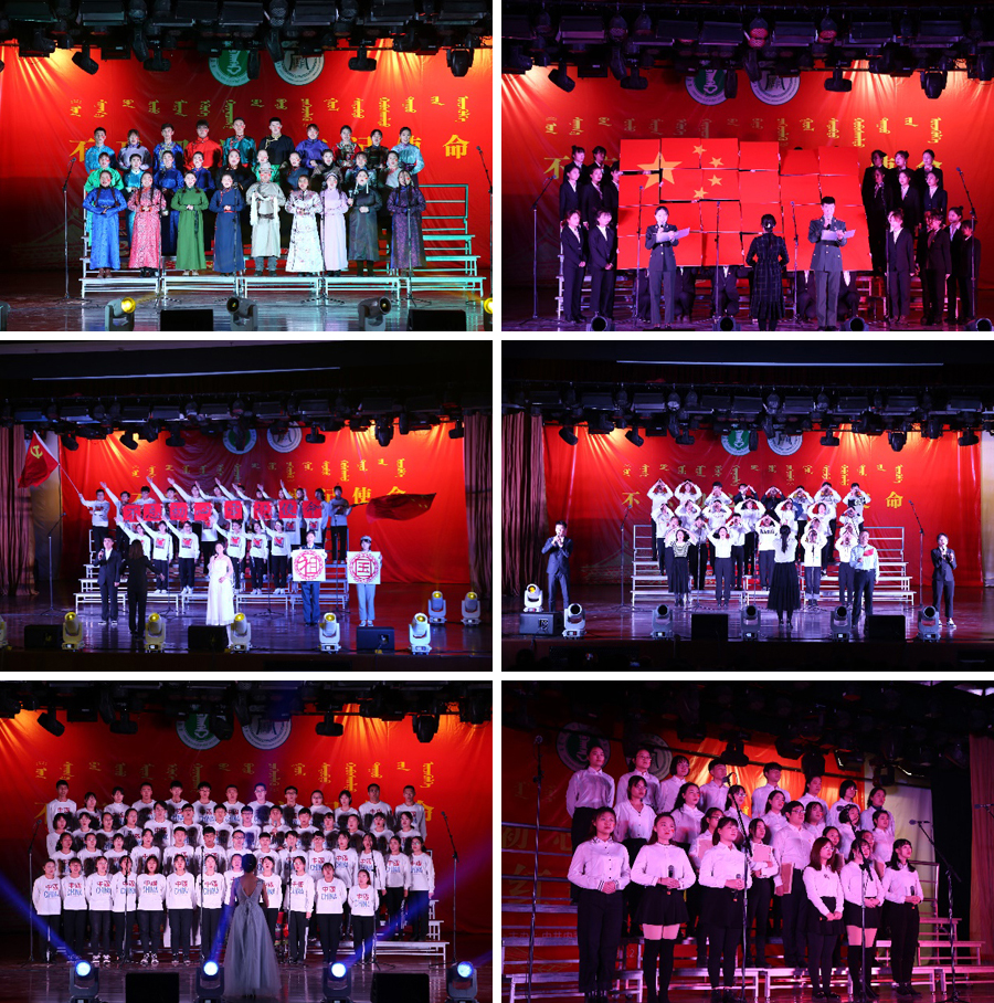传承红色基因,唱响红色经典,一曲曲动人心弦的经典红歌饱含深情,嘹亮的歌声仿佛在提醒我们不能忘记革命时期的峥嵘岁月,牢记来时路。《不忘初心》、《没有共产党就没有新中国》、《保卫黄河》等歌曲唤起大家对峥嵘岁月的回忆,激励我们不忘初心,砥砺前行;《我和我的祖国》、《祖国母亲》、《歌唱祖国》、《爱我中华》等歌曲,赞祖国盛世,道出了中华儿女对祖国的深厚感情;《走向复兴》、《天耀中华》等歌曲气势恢宏,震撼人心,共同祝愿祖国繁荣昌盛。