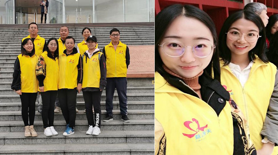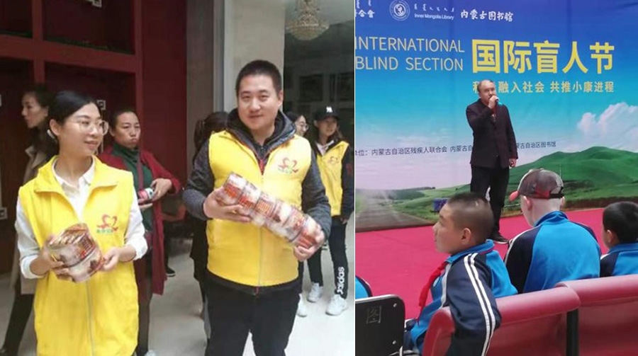 预备党员2016级经济与金融班高静和2016级经济学汉班李美慧同学参加了国际盲人节盲友联谊会志愿服务活动,主要任务是搀扶盲人由内蒙古图书馆广场进出图书馆及活动区域。