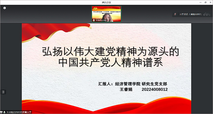 研究生党支部王睿娟同学以“弘扬以伟大建党精神为源头的中国共产党人精神谱系”为题对中国共产党人精神谱系进行详细的梳理,并全面深入阐述了其价值意蕴、精髓要义及弘扬路径。