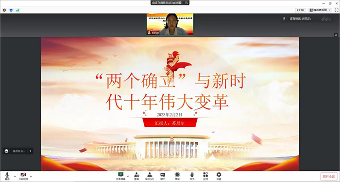 为持续深入学习贯彻落实党的二十大精神,经济与金融党支部、研究生党支部、本科生第一党支部联合举办的“研究阐释党的二十大精神 师生联合微党课”主题党日活动(第三期)于2023年2月2日线上举行。本次微党课主题为“理论与实践创新”,杨蕴丽、包秀琴、巴特尔、丁继、乔涵等教师及60余名学生党员参加。包秀琴、王睿娟、苏尼尔担任本次微党课的主讲嘉宾,宝苏雅拉主持研讨会。