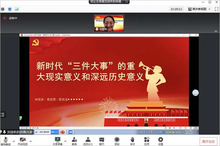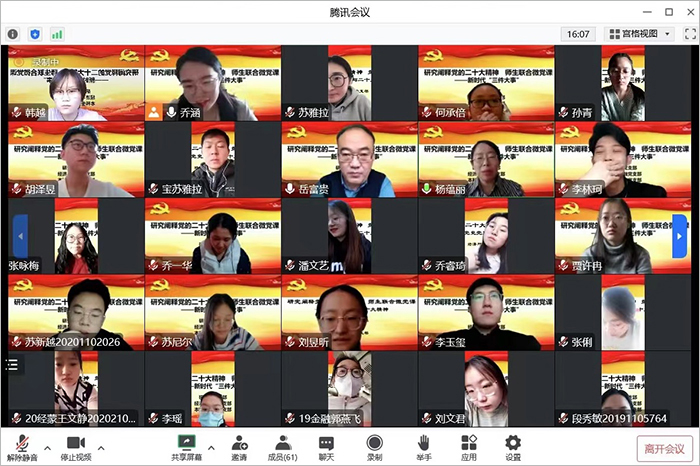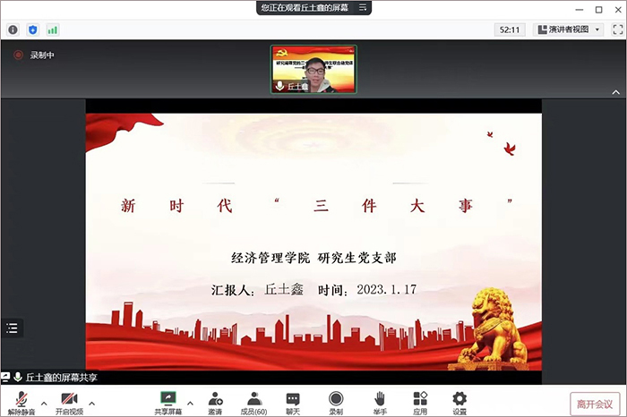 为持续深入学习贯彻党的二十大精神,经济与金融党支部联合研究生党支部、本科生第一党支部举办的“研究阐释党的二十大精神 师生联合微党课”主题党日活动第二期于2023年1月17日在线进行。第二期微党课主题是“新时代三件大事”,会议由乔涵主持,杨蕴丽、岳富贵、宝苏雅拉、苏雅拉等教师及60余名学生党员参加此次微党课学习。岳富贵、丘土鑫、刘昱昕担任本次微党课主讲嘉宾。