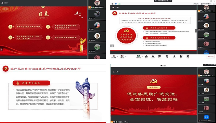 支部党员韩越同志结合党的二十大报告和习近平总书记关于民族工作的重要论述,从坚持和完善民族区域自治制度、提升民族事务治理体系和治理能力现代化水平、促进各民族广泛交往全面交流深度交融、构筑中华民族共有精神家园四个部分为同学们介绍了党的民族政策、民族区域自治制度以及民族团结进步创建工作等相关内容。