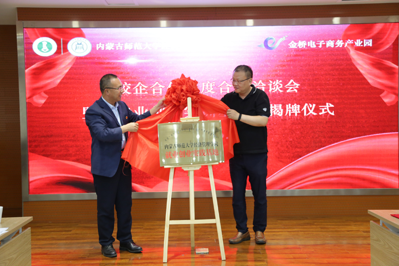 校党委委员、组织部长褚亚申与园区运营企业内蒙古通研电子商务有限责任公司董事长付长青共同为就业创业实践基地揭牌。