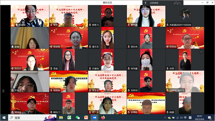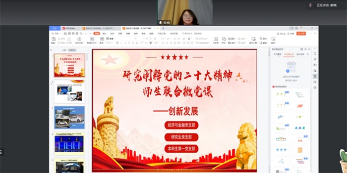 为学习贯彻习近平新时代中国特色社会主义思想和党的二十大精神,4月6日经济与金融党支部联合研究生党支部、本科生第一党支部在线举行第七期“研究阐释党的二十大精神”师生联合微党课,主题是“创新发展”。微党课由杨蕴丽主持,65位师生党员和积极分子参加了学习讨论。姜楠、滕怀雅、杨帆3位同志担任了主讲嘉宾。