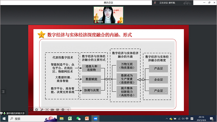 接着,研究生党支部滕怀雅为大家阐释了《数字经济与实体经济深度融合发展问题》,结合发展现状、主要内涵探讨了产品层面、企业层面、产业层面数字经济与实体经济深度融合的实现逻辑,针对重点问题从技术自立自强、发展智能制造、推动企业数字化转型、完善融合生态系统等方面提出了优化策略。她把理论学习与科学研究有机结合的探索精神,值得大家学习借鉴。
