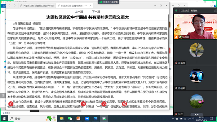 5月25日,结合专题教育和学校《开展民族团结“三月一周”工作方案》有关要求,党支部书记杨蕴丽以《边疆牧区建设中华民族共有精神家园意义重大》为题讲了一次专题党课。中华民族共有精神家园是56个民族共同塑造、传承和发扬的文化精神、情感态度和价值观。由于地理位置的特殊性,边疆牧区建设中华民族共有精神家园是筑牢国家第一道安全防线的需要,是巩固脱贫攻坚和实现乡村产业振兴的需要,是跨国界民族交往和多民族融合的需要,是增进各族人民民生福祉的需要,是打造祖国北疆亮丽风景线的需要,必须从“五位一体”总体布局统筹谋划、系统推进,引领各族人民为实现中华民族伟大复兴而奋斗。有关文稿已经在《内蒙古日报》上发表。