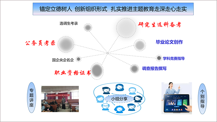 5月25日,党支部委员会重点研究如何“创新形式 扎实推进主题教育走深走心走实”。贾曼莉建议为学生开展论文选题指导讲座,包秀琴建议开展考研指导讲座,杨蕴丽建议每个党员领衔一个专题,围绕调查报告撰写、学科竞赛指导、毕业论文创作、研究生选科备考、职业资格证考试、公务员考录、选调生考录、应聘国企央企等学生关切问题,通过“学用新思想 建功新时代”系列主题党日发挥党建助研助学助教功能,构建“专题讲座+小组分享+个别指导”相结合的专业素养拓展机制,不断提升一流人才培养质量。
