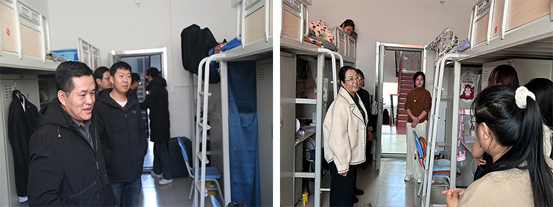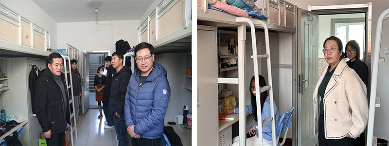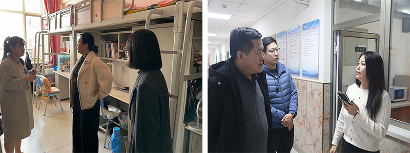 领导智如水、胡伟华、辅导员马运泽、郭喜桐、宝苏雅拉深入学生公寓,倾听学生诉求、排查安全隐患。