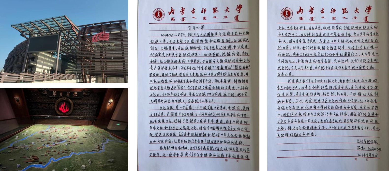 2023级入党积极分子陈鑫追随习近平总书记的足迹来到山西省运城市博物馆。2023年5月16日,习近平总书记考察山西省运城市博物馆时强调,博物馆有很多宝贵文物甚至“国宝”,它们见证了我国百万年的人类史、一万年的文化史、五千多年的文明史,要认真贯彻落实党中央关于坚持保护第一、加强管理、挖掘价值、有效利用、让文物活起来的工作要求,全面提升文物保护利用和文化遗产保护传承水平。在活动中,她深刻感受到中华优秀传统文化在现代化进程中传承和发展的重要性,并表示要以更加开放的姿态拥抱世界、以更加创新的思维探索未来。