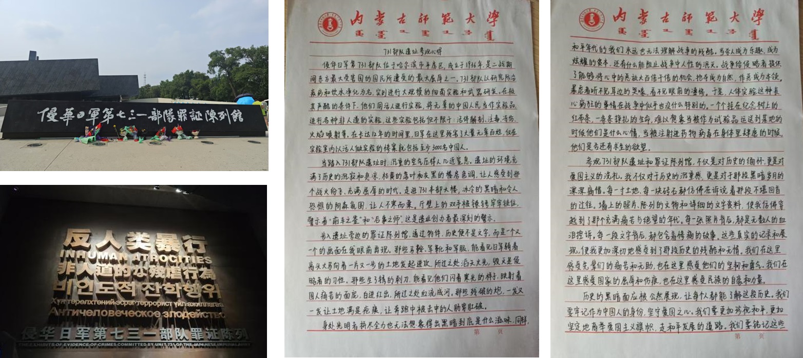 2023级党员刘清嫄追随历史足迹来到黑龙江哈尔滨731部队遗址和罪证陈列馆。墙上的照片、陈列的文物和详细的文字资料,让她仿佛身临其境,感受到那个充满痛苦与绝望的年代。在参观过程中,她深刻感受到历史的沉重和爱国主义的力量,并表示要铭记历史,以实际行动继承和发扬前辈的精神,为实现中华民族伟大复兴的中国梦不懈奋斗。