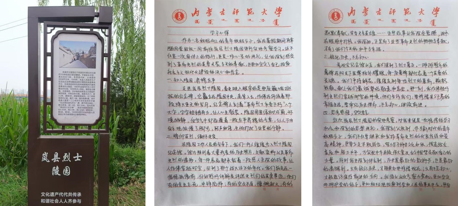 2023级入党积极分子张晶晶来到山西省吕梁市岚县烈士陵园。在参观过程中,她感受到岚县儿女坚韧不拔的毅力、大无畏的英雄气概和不怕牺牲的战斗精神,正是由于英雄前辈的浴血奋战才有我们今天的幸福生活。