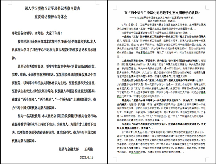 习近平总书记在巴彦淖尔的考察活动及讲话意义重大,支部党员积极踊跃发言、抒发学习心得。包秀琴同志认为,习近平总书记提出:“三北”防护林体系工程建设、退耕还林还草、京津风沙源治理等一批重点生态工程绿色惠民成效显著,铸就了“三北精神”,树立了生态治理的国际典范,这为我们进一步发展提振了信心、指明了方向,内蒙古要结合地区优势建设好特色产业。王秀艳同志表示,要把总书记的殷殷嘱托转化为自觉行动,结合党中央对内蒙古的“五大定位”在提升教学科研水平上持续下功夫,在为党育人、为国育才上持续下功夫,奋力书写中国式现代化内蒙古新篇章。姜楠同志认为,“总书记在内蒙古巴彦淖尔考察时的重要讲话鼓舞人心,催人奋进”,从“西部大开发”到“兴边富民”再到“山水林田湖草沙一体化保护与治理”等战略和思想,能找到一系列值得深化研究的项目,可以组建团队、深入挖掘、扎实调研,并产出高质量成果。岳富贵、巴特尔、贾曼莉等同志也从自身的角度出发,表达了对习近平总书记重要讲话的学习心得和深刻体会,提出了对于自身发展、学科发展、学院发展的规划与展望。