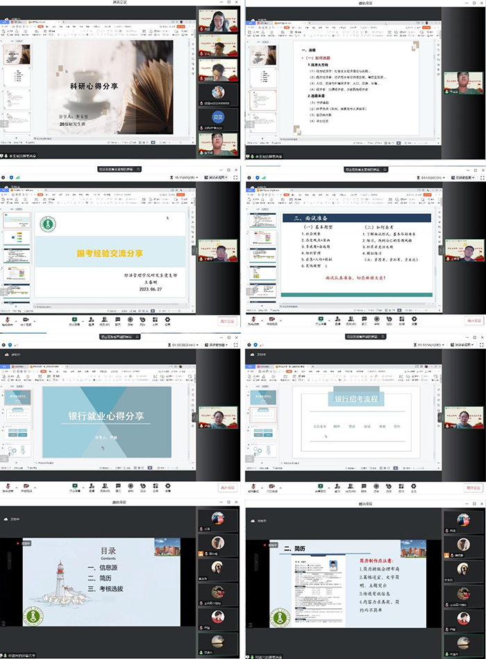 交流分享会上,毕业生党员李玉玺、王春刚、杨陆杰、张安、芦越、邓道兴同志分别就研究生科研、公务员考试、银行招录、国企招录等方面进行经验交流。李玉玺同志从论文选题、文献梳理、研究方法、数据搜集、研究框架和时间安排六个板块分享科研心得,并提醒同学们抓紧时间提前谋划,早出成果。王春刚同志从国家公务员岗位选择、考试内容、考试时间地点和笔试面试准备过程等方面分享经验。杨陆杰和张安同志做公务员考试经验补充,强调国考上岸的秘诀是勤学多练、不走捷径。芦越同志从各类银行招考公告发布、网申、笔试、面试、体检、签约等方面分享经验。邓道兴同志从就业招聘信息获取、简历制作和考核选拔三方面分享经验,强调在求职中一定要勇敢尝试,深入理解所应聘岗位的特性和要求,提前做好充分准备。