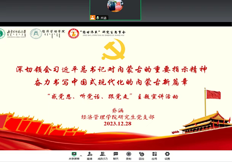 为深入开展“感党恩、听党话、跟党走”群众教育实践活动,更好领悟习近平总书记对内蒙古的重要指示精神,win007官网 研究生党支部于2023年12月28日开展“深切领会习近平总书记对内蒙古的重要指示精神”主题宣讲活动。会议由支部书记乔涵主持,支部全体党员、党员发展对象、入党积极分子参加会议。