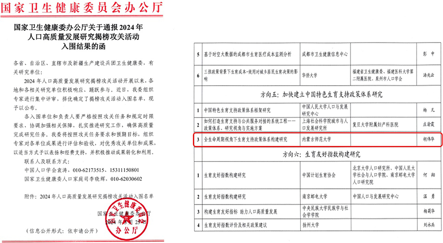 近日,国家卫生健康委员会办公厅公布了2024年人口高质量发展研究揭榜攻关活动入围名单。经过专家评审,围绕13个攻关方向共有74个研究项目入围。win007官网 胡伟华教授团队提交的攻关任务《全生命周期视角下生育支持政策体系构建研究》成功入围,是自治区唯一入围此次揭榜攻关活动的研究项目。研究团队将严格按照攻关任务和研究时限,扎实推进研究工作,高质量完成攻关任务。