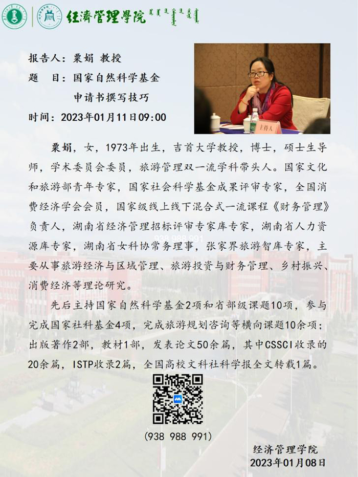 为做好2023年度国家自然科学基金项目申请工作,进一步提升申报数量、质量、资助率,2023年01月11日上午,举办2023年度国家自然科学基金申报专题讲座,特邀吉首大学粟娟教授作《国家自然科学基金申报交流》专题讲座。本次讲座采取线上方式进行,讲座由胡伟华教授主持,学院专任教师30多人聆听讲座。科技处副处长邬友参会指导。