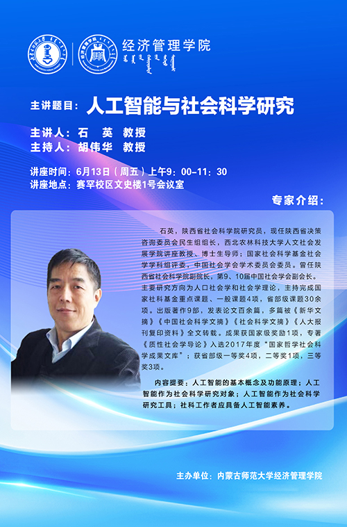 于6月13日上午成功举办了《人工智能与社会科学研究》专题学术讲座。本次讲座特邀陕西省社会科学院研究员、西北农林科技大学人文社会发展学院讲座教授、博士生导师石英担任主讲,学院党委书记智如水、全体教师、全体研究生参加了讲座。讲座由胡伟华教授主持。