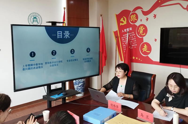 胡伟华副院长依据期中教学检查的工作要求,围绕上学期期中教学检查问题的改进情况、常规教学运行学院自查情况、专业优化情况、审核评估自查自建情况等四个方面做了具体汇报。重点介绍了学院专业优化调整的思路与举措、审核评估自查中存在的问题以及改进措施两项专项检查工作开展情况。