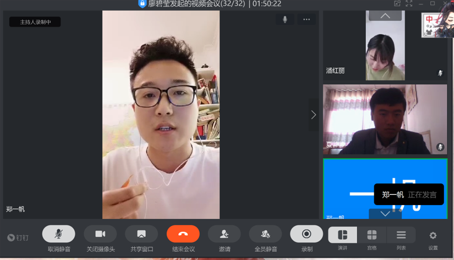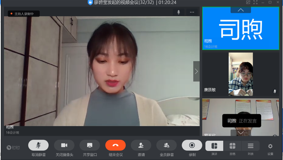 《2020届本科毕业论文在线答辩工作的安排方案》具体部署,5月16日上午8:20——12:00,财会系组织开展了会计学专业2020届毕业论文线上答辩会。答辩会共分为两组,在钉钉一群、二群同时进行,共57位同学参加了答辩,其中56位同学顺利通过,1位同学未通过(已于17日晚7:00补答辩通过)。