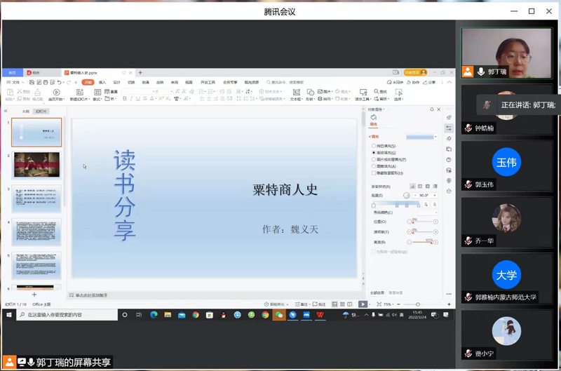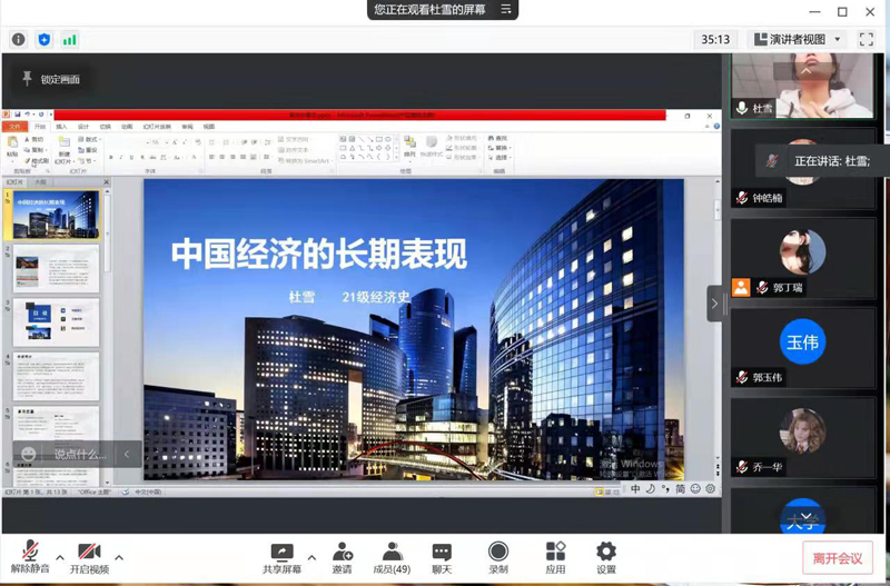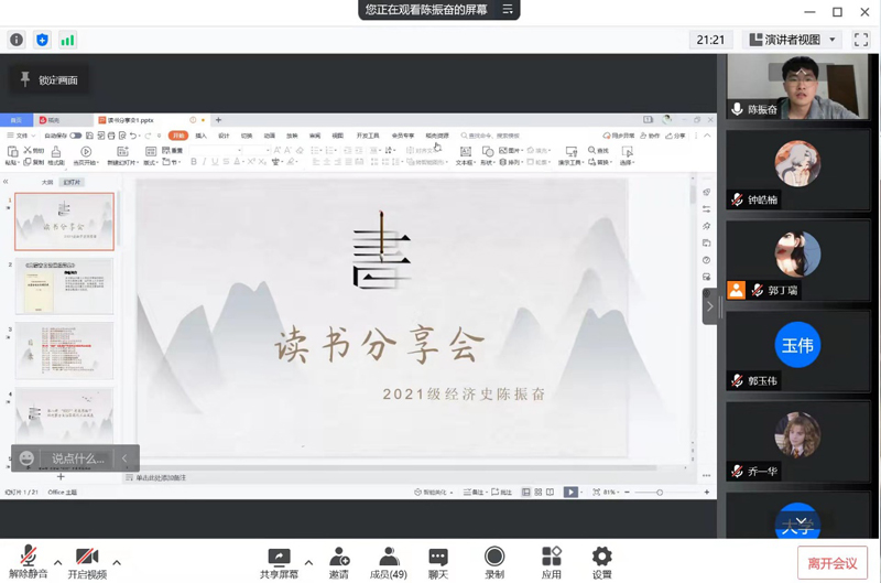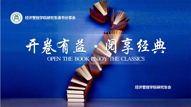 通过腾讯会议在线开展了“开卷有益,阅享经典”2022年第一期读书分享会,本期读书分享会由2021级经济史专业研究生郭丁瑞同学主持,研一研二全体研究生参加此次读书分享会。本次分享的五位同学对其分享的书籍进行了简要的概括,突出重点内容,激发了同学们对相关内容的探讨。