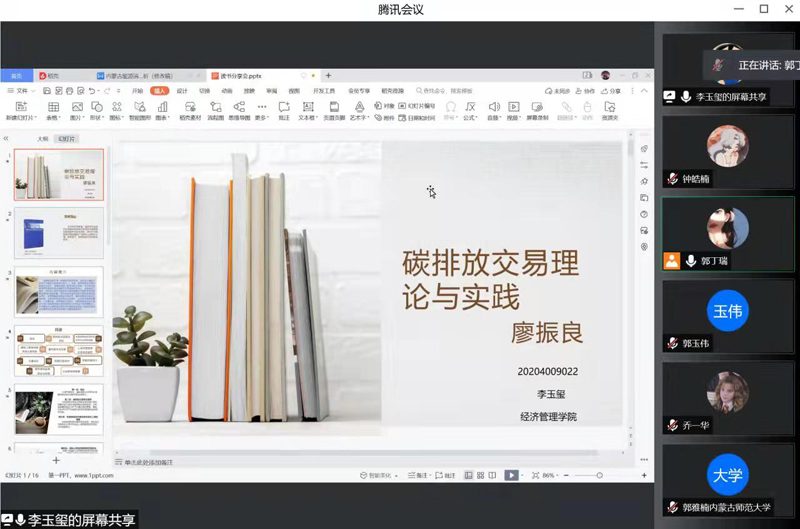 第一位分享的同学是2020级人口、资源与环境经济学专业的李玉玺,他分享的书籍是廖振良的《碳排放交易理论与实践》,本书在总结碳排放交易基本理论和国外发展情况的基础上,全面梳理了国内,特别是上海市在碳排放交易机制建设方面所取得的重要进展和存在的问题,具体内容包括碳排放交易的背景和基本理论、欧盟等国际碳排放交易体系、国内碳排放交易试点的进展、上海市碳排放交易试点的剖析、企业碳信息的披露等,从总量设定、碳排放额分配设计、碳排放额拍卖设计和MRV等方面对碳排放交易机制进行分析是本书的重要特点。