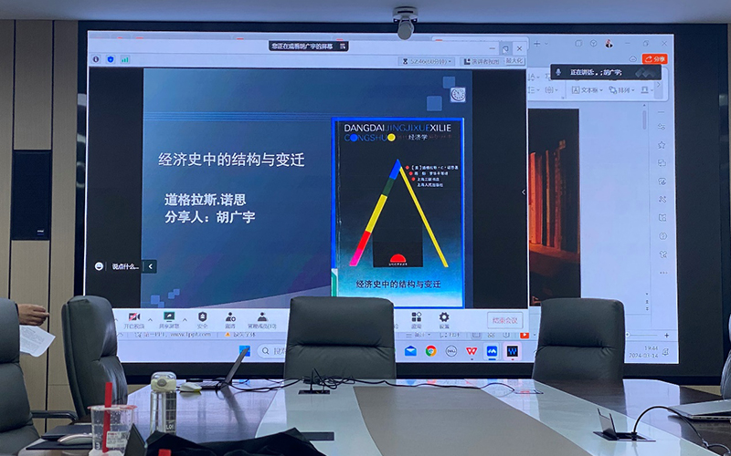 第三位分享的是22级经济史专业研究生胡广宇同学,分享的书目是《经济史中的结构与变迁》,作者是美国经济学家道格拉斯·诺思,该书以西方产权理论、制度变迁理论对经济史进行了解释,提出了对经济增长起决定作用的是制度因素,而非技术因素,产权制度的变迁才是历史演进的源泉的核心观点。国家则规定着产权的结构并最终对产权结构的效率负责。此外,由于约束行为的衡量费用很高,如果没有理想信念约束个人最大限度追逐利益,会使经济组织的活力受到威胁。这本书从制度创新和制度变革来解释长期经济增长和人类社会的演进,显然是富有启示意义的。